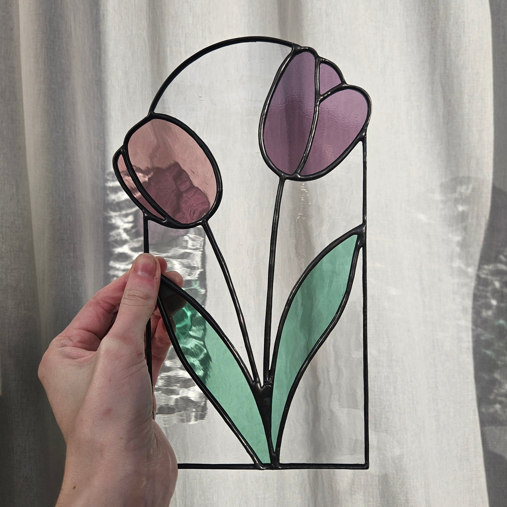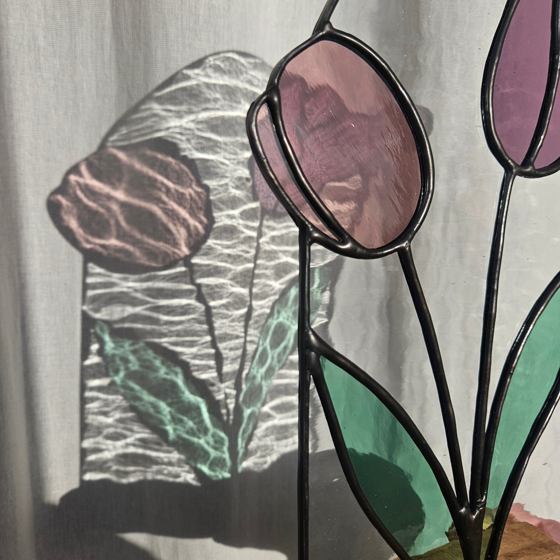 This contemporary tulip panel is made with two different shades of transparent purple glass for tulips, sea green glass for the leaves and clear waterglass for the background.