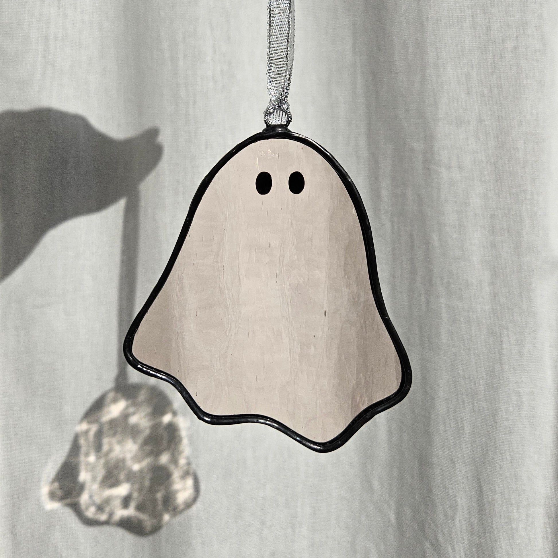 Made with transparent pale pink glass. The eyes are painted on with black enamel paint and they have a black lead solder border.