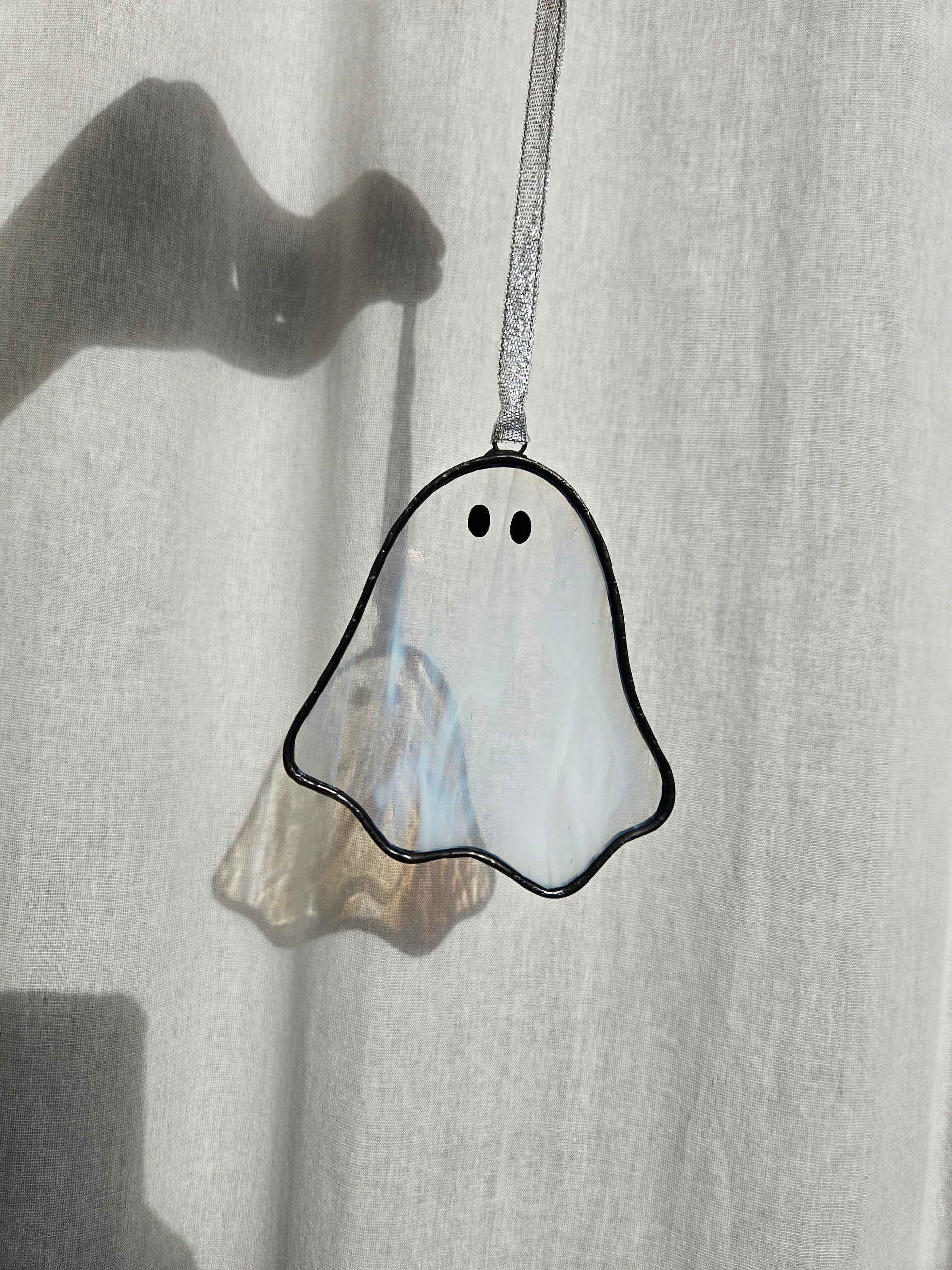 Made with clear & white wispy glass. The eyes are painted on with black enamel paint and they have a black lead solder border.