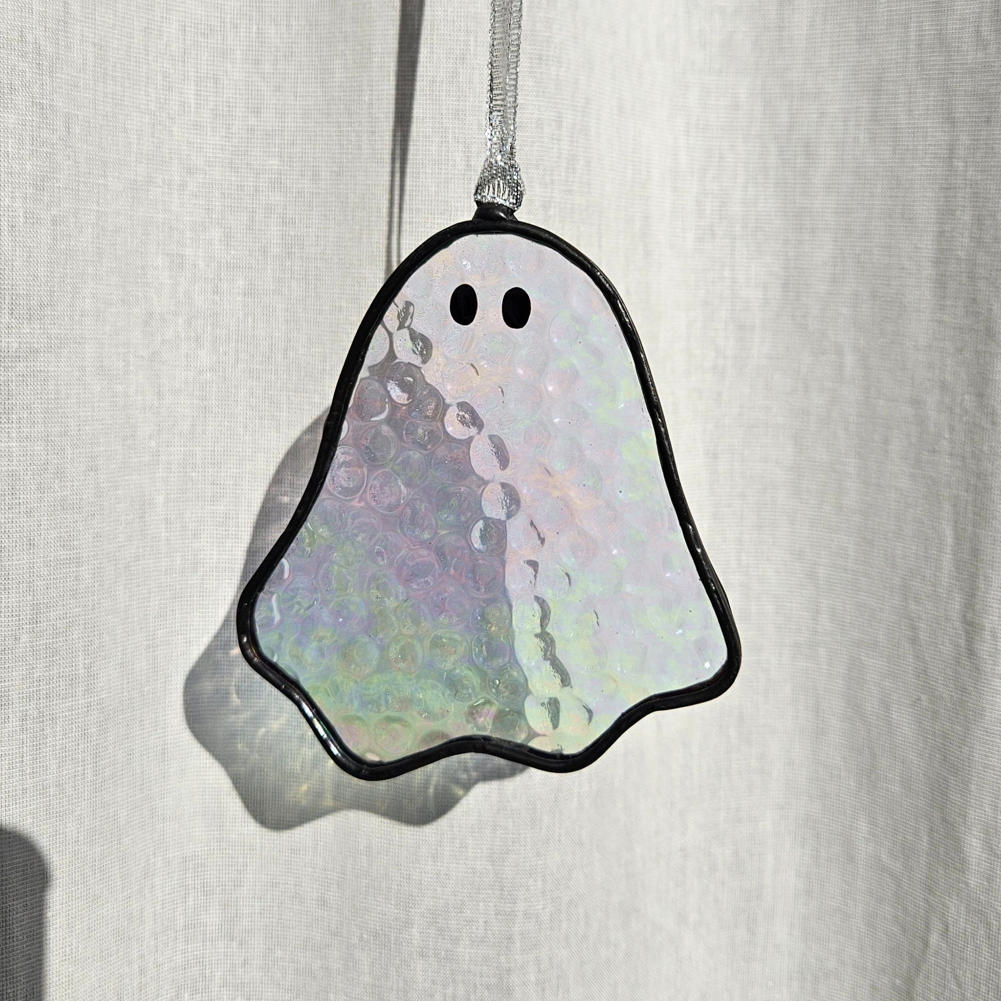 Made with hammered iridescent glass. The eyes are painted on with black enamel paint and they have a black lead solder border.