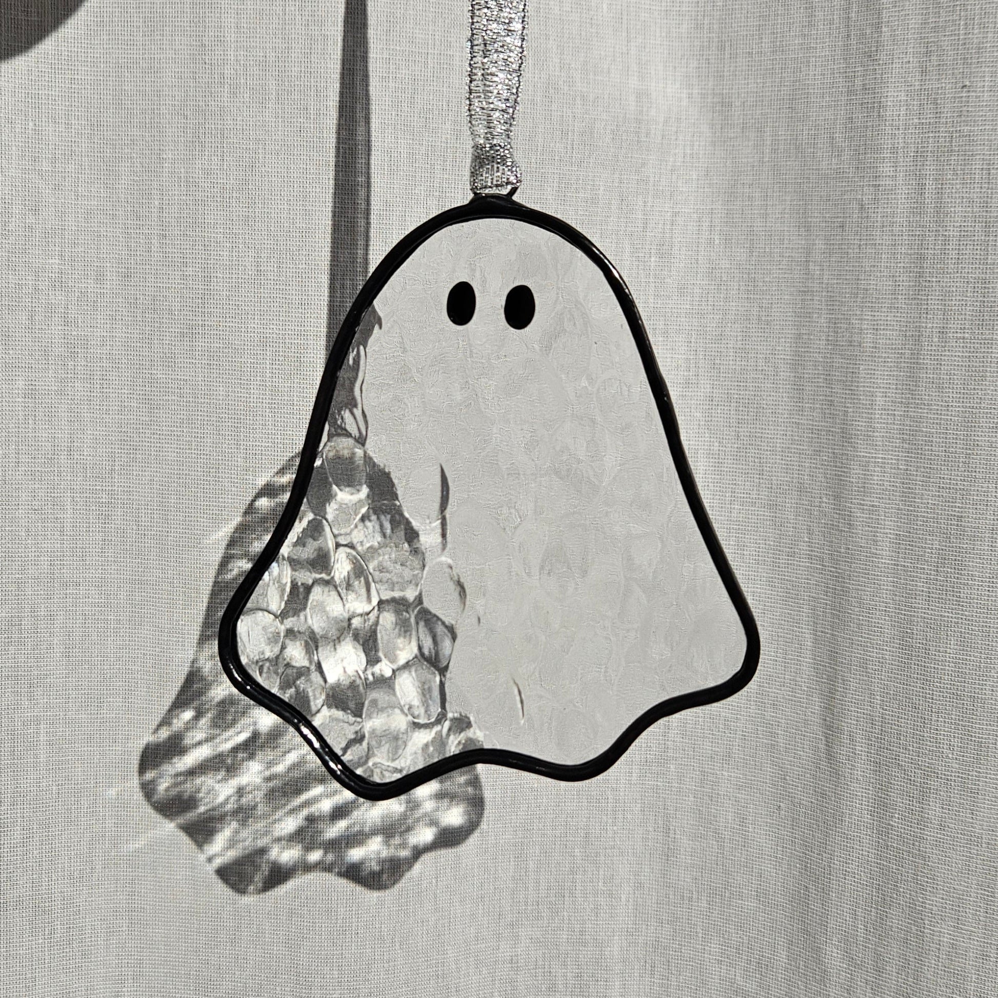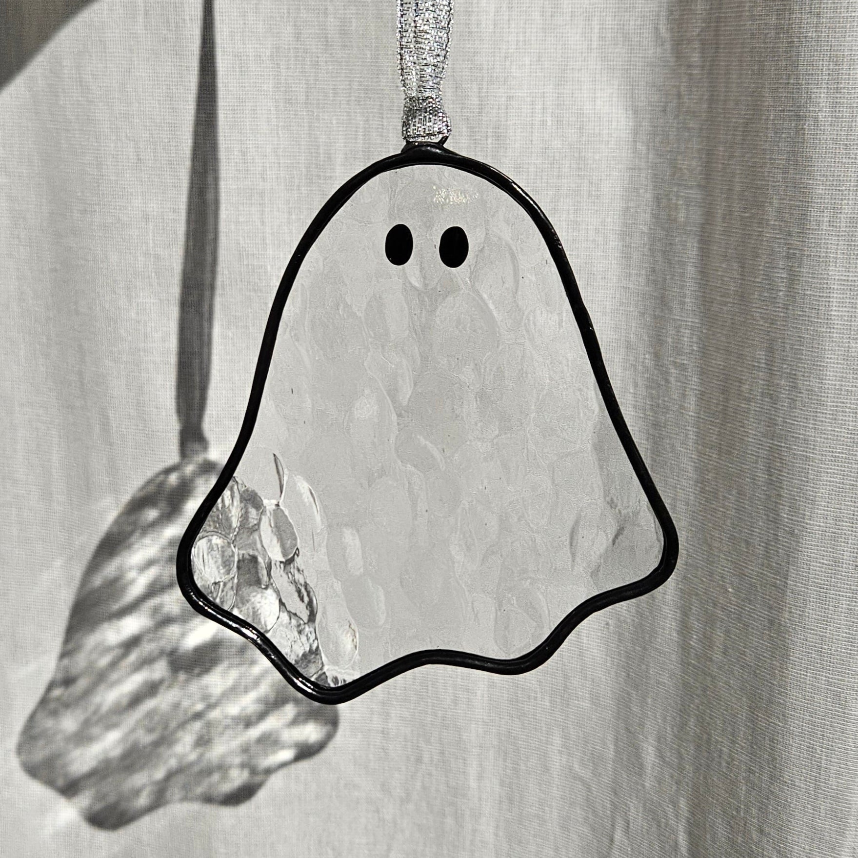Made with clear textured glass. The eyes are painted on with black enamel paint and they have a black lead solder border.