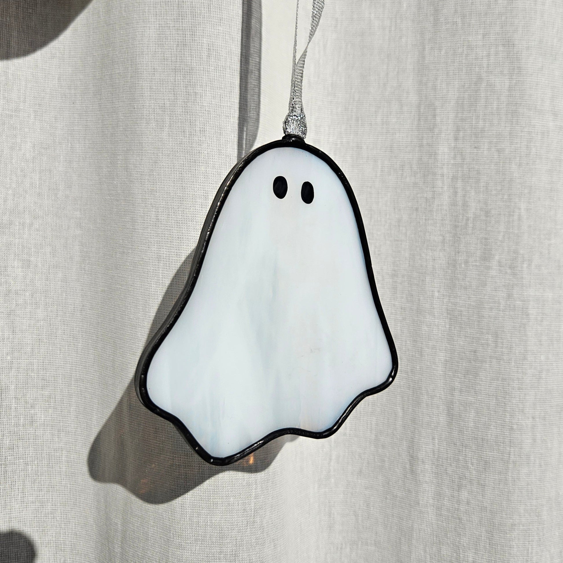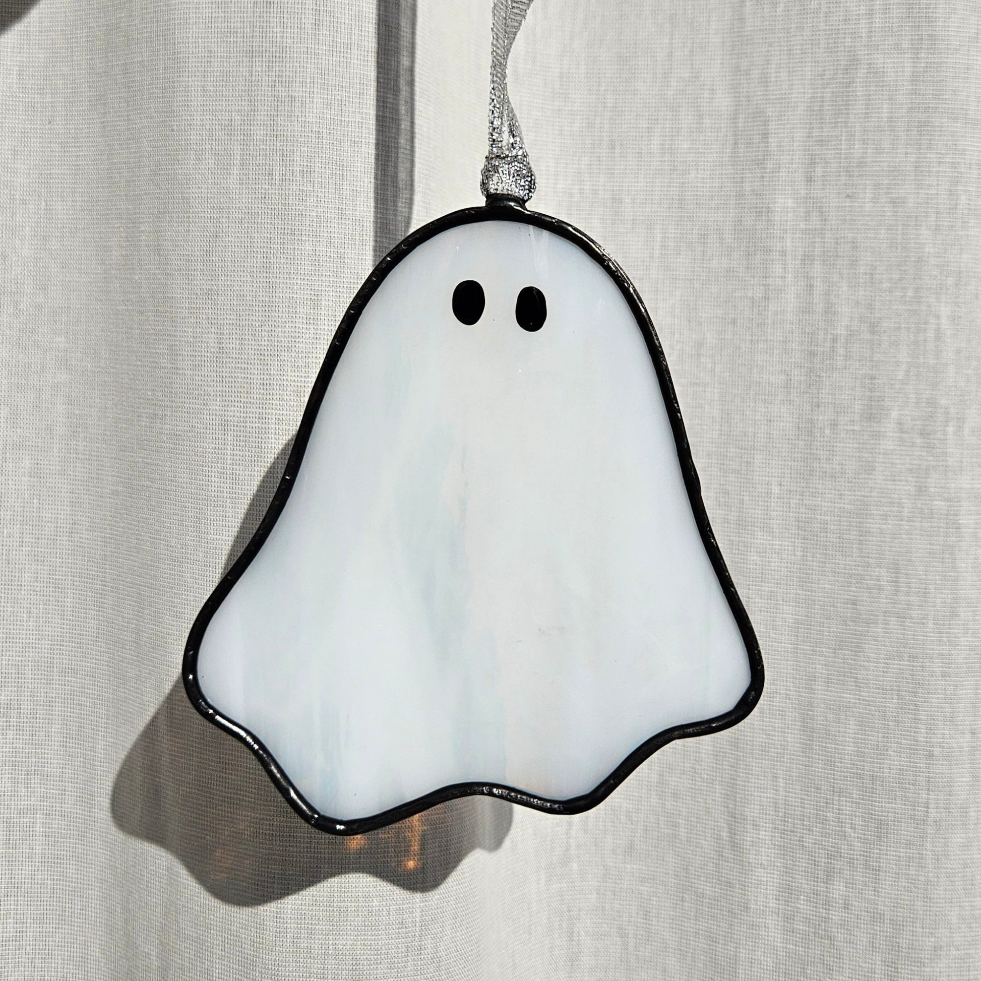 Made with wispy white glass. The eyes are painted on with black enamel paint and they have a black lead solder border.